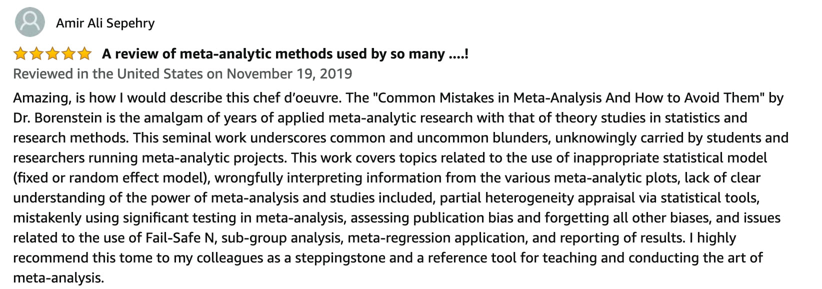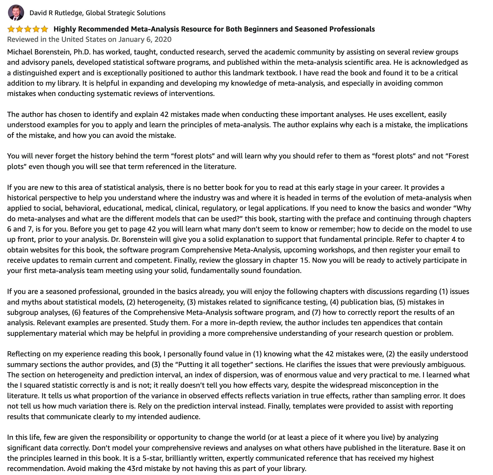 Michael Borenstein is the master of accessible and accurate explanations. Thank you, Michael, for drawing on your vast experience mentoring thousands of people around the globe, to produce this book for us. Its value is immense. It is my hope that all scholars undertaking research synthesis will have this book by their side.